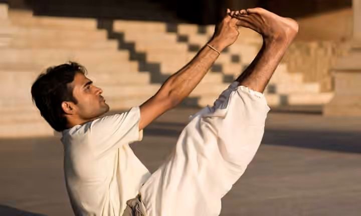 In Angamardana, you use your own body weight and momentum to increase the flexibility of the muscle over a period of time. It is taught as a series of dynamic processes (7 standing, 8 squatting, 5 sitting, and 7 lying down) to invigorate the body and reach peak physical and mental health.