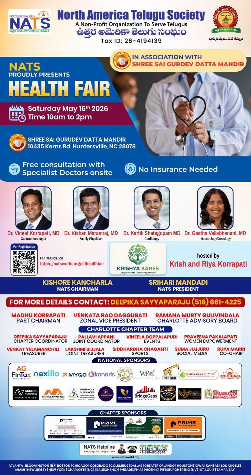 πΈβ¨ A community health fair bringing together specialist doctors to provide free consultations and compassionate care. No insurance needed β just walk in and benefit from expert guidance, wellness support, and Telugu community togetherness.