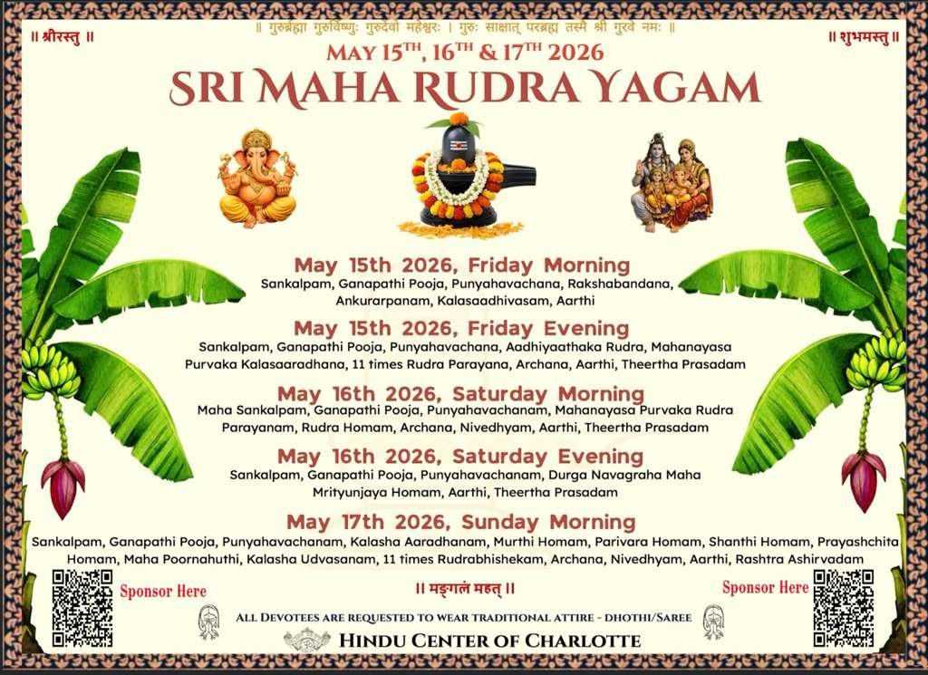 🙏 Join us at the Hindu Center of Charlotte for an unforgettable journey of devotion and blessings during the Sri Maha Rudra Yagam, happening on May 15th, 16th & 17th, 2026.