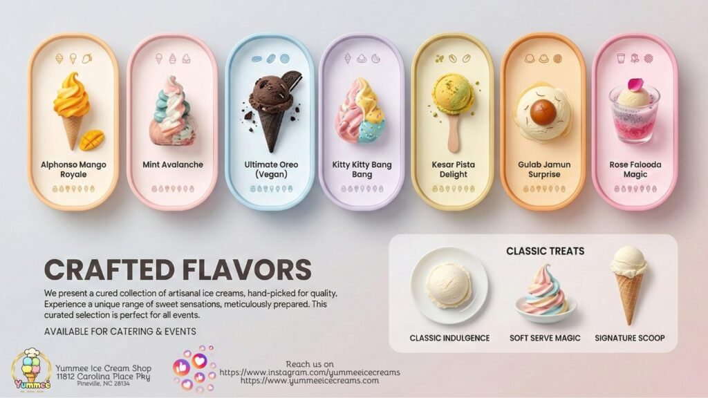 Taste the magic at Yummee Ice Cream in Pineville! 🍦 From Mango Royale and Vegan Oreo to Rose Falooda and Gulab Jamun Surprise, our artisanal scoops and soft serves are a dream. Enjoy classic cones or unique “Crafted Flavors” today. Your perfect sweet treat awaits! ✨ #PinevilleEats